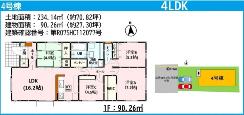 | 敷地面積 | 234.14㎡(70.82坪) | 建物面積 | 90.26㎡ (27.30坪) |