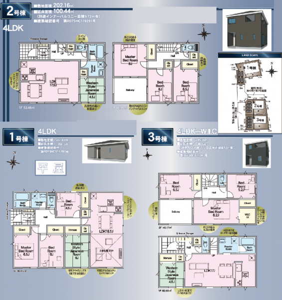 1号棟平屋:261.07㎡(土地)、93.15㎡(建物)、2488万円 3号棟:205.38㎡(土地)、98.82㎡(建物)、2388万円 |