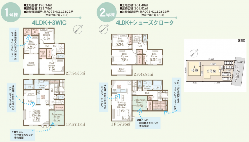 2号棟:164.48㎡(土地)、106.81㎡(建物)、3698万円 長期優良住宅 |