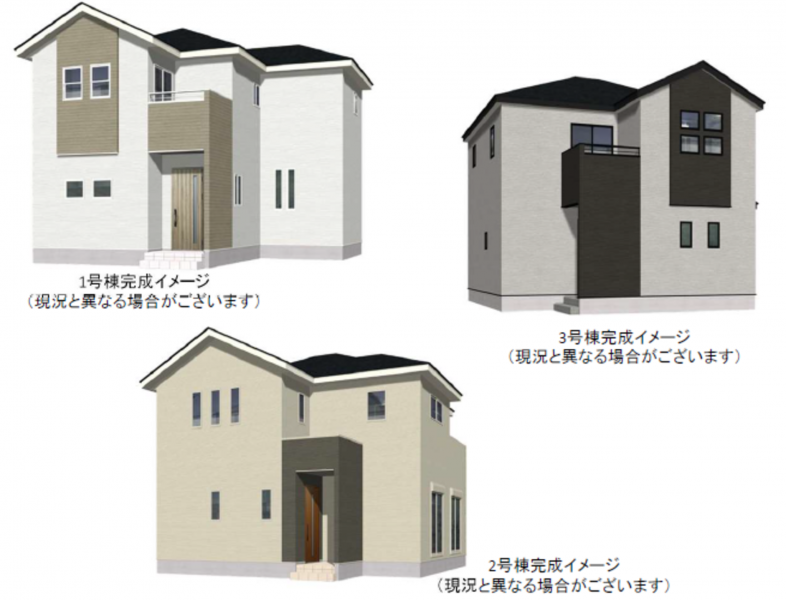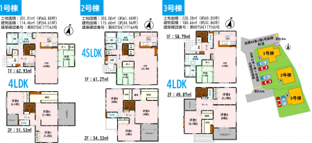1号棟:201.01㎡(土地)、114.46㎡(建物)、3198万円 2号棟:203.00㎡(土地)、115.60㎡(建物)、3098万円 |