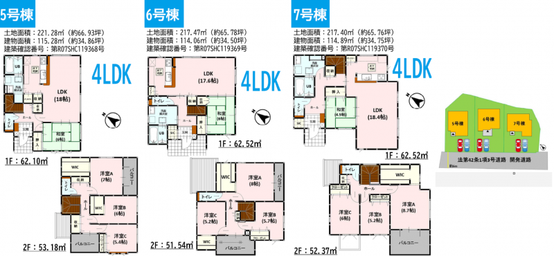 6号棟:217.47㎡(土地)、114.06㎡(建物)、3298万円 7号棟:217.40㎡(土地)、114.89㎡(建物)、3198万円 |