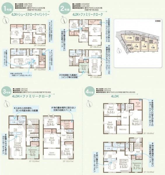 1号棟:168.70㎡(土地),107.64㎡(建物),3298万円 2号棟:153.83㎡(土地),110.13㎡(建物),3198万円 4号棟:146.27㎡(土地),102.67㎡(建物),3098万円 網戸、照明、濡縁、カーテンレール、防水パン、カーポートはオプションとなります。宅地内に電柱及び支線が入る場合があります。 |
