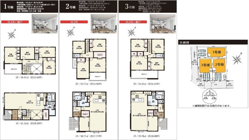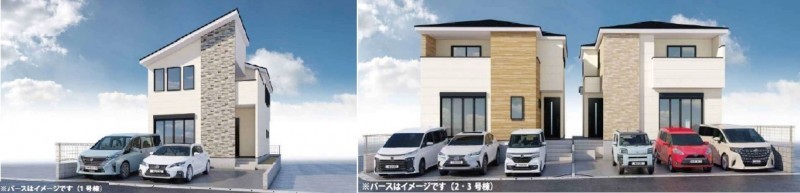 2号棟:133.24㎡(土地)、111.54㎡(建物)、3,799万円 3号棟:133.12㎡(土地)、114.03㎡(建物)、3,999万円 2・3号地:敷地面接とは別に協定地部分約0.49㎡有り 3号地:建ぺい率70%(角地緩和含む)、セットバック部分約0.11㎡有り |