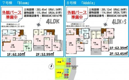 8号棟:205.12㎡(土地)、114.84㎡(建物)、4SLDK、3398万円 網戸、照明器具、カーテンレール、CATV等は別途注文となります。 |