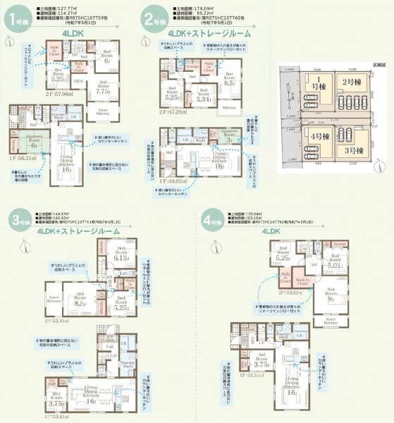 1号棟:127.77㎡(土地)、114.27㎡(建物)、4098万円 2号棟:174.09㎡(土地)、95.22㎡(建物)、4198万円 3号棟:164.83㎡(土地)、106.82㎡(建物)、3978万円 |