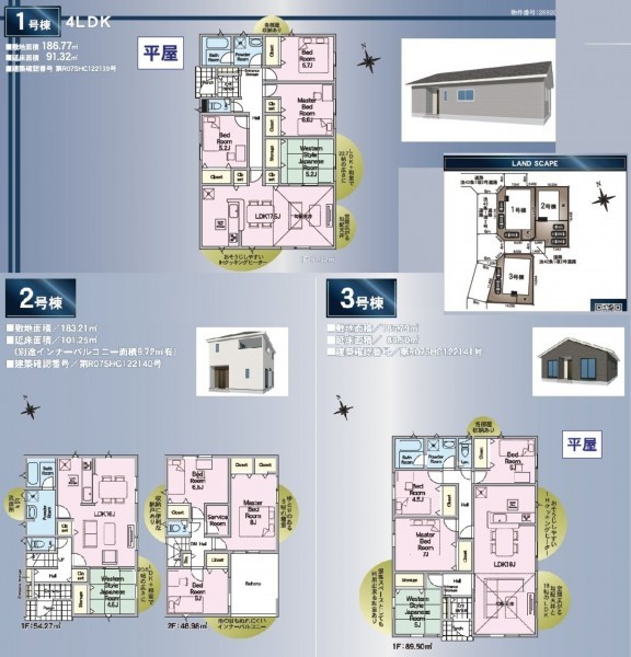 1号棟平屋:186.77㎡(土地)、91.32㎡(建物)、2488万円 3号棟平屋:186.79㎡(土地)、89350㎡(建物)、2488万円 |