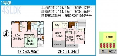 | 敷地面積 | 195.44㎡(59.12坪) | 建物面積 | 114.27㎡ (34.56坪) |