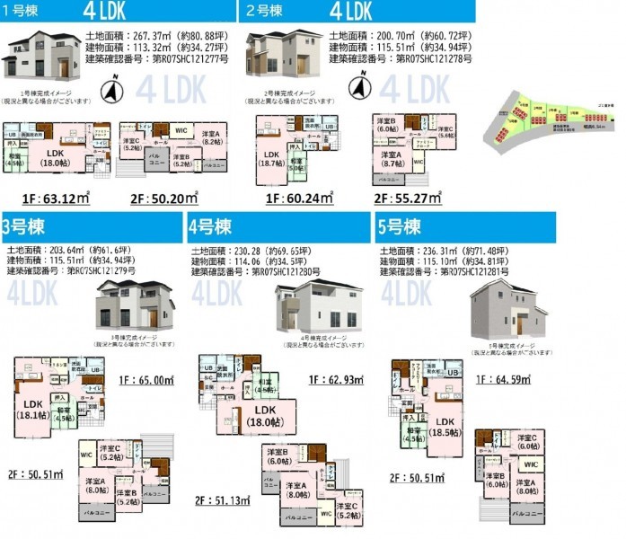 1号棟:267.37㎡(土地)、113.32㎡(建物)、3198万円 2号棟:200.70㎡(土地)、115.51㎡(建物)、3398万円 3号棟:203.64㎡(土地)、115.51㎡(建物)、3398万円 4号棟:230.28㎡(土地)、114.06㎡(建物)、3298万円 |