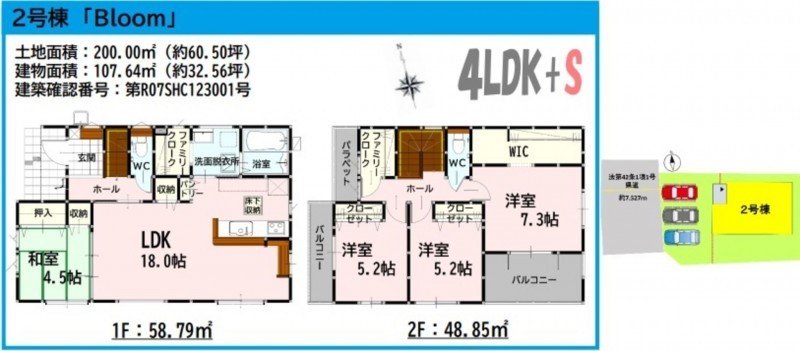 | 敷地面積 | 200.00㎡(60.50坪) | 建物面積 | 107.64㎡ (32.56坪) |