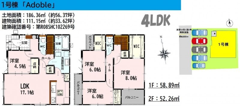 | 敷地面積 | 186.36㎡(56.37坪) | 建物面積 | 111.15㎡ (33.62坪) |