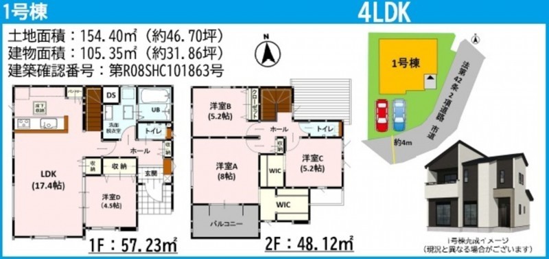 | 敷地面積 | 154.40㎡(46.70坪) | 建物面積 | 105.35㎡ (31.86坪) |