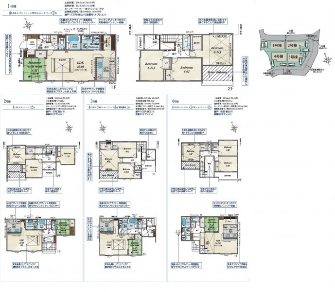 2号棟:183.90㎡(土地)、114.63㎡(建物)、3240万円 3号棟:215.86㎡(土地)、109.09㎡(建物)、3480万円 4号棟:176.84㎡(土地)、108.05㎡(建物)、3420万円 2~4号棟(任意後退部分有) |