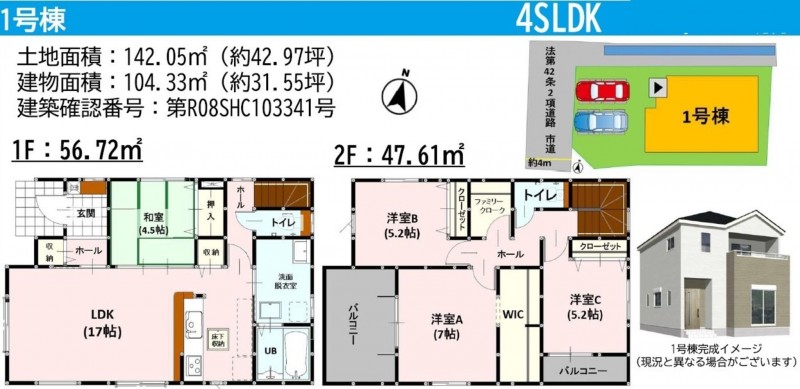| 敷地面積 | 142.05㎡(42.97坪) | 建物面積 | 104.33㎡ (31.55坪) |