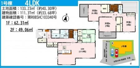 | 敷地面積 | 133.23㎡(40.30坪) | 建物面積 | 111.37㎡ (33.68坪) |